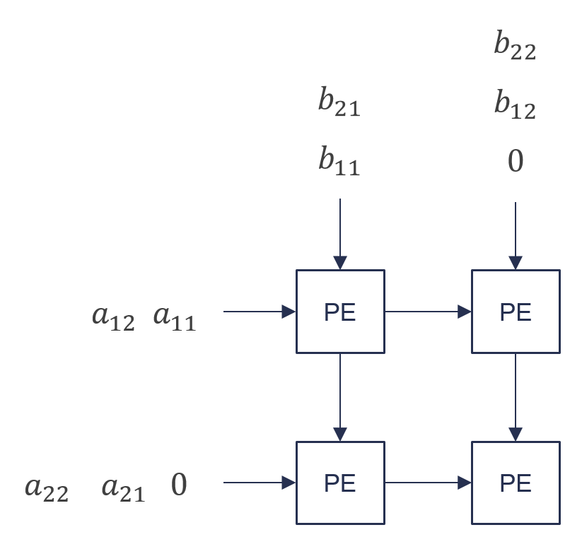 안녕하세요. 오늘은 systolic array에 대해 알아보도록 하겠습니다. Systolic Array는 인공지능 연산의 핵심 연산인 행렬곱을 병렬로 파이프라이닝 하여 처리하며, 데이터 흐름을 최적화하여 계산 효율과 자원 활용도를 극대화합니다. 구글의 TPU를 포함한 여러 AI 하드웨어에서도 이 구조가 채택되며, CNN 연산의 하드웨어 가속화에서 중요한 역할을 하고 있습니다. 이번 포스트에서는 systolic array에서 어떻게 컨볼루션 연산 시 데이터를 처리하는지 간단한 예시와 함께 알아보도록 하겠습니다.  행렬 A와 B, 그리고 이 두 행렬의 곱은 위 수식과 같이 이루어지게 됩니다. 곱하고 더하는 과정이 반복되는 것을 확인할 수 있습니다. 위의 행렬곱과 같은 연산을 수행하는 2x2 시스톨릭 어레이입..