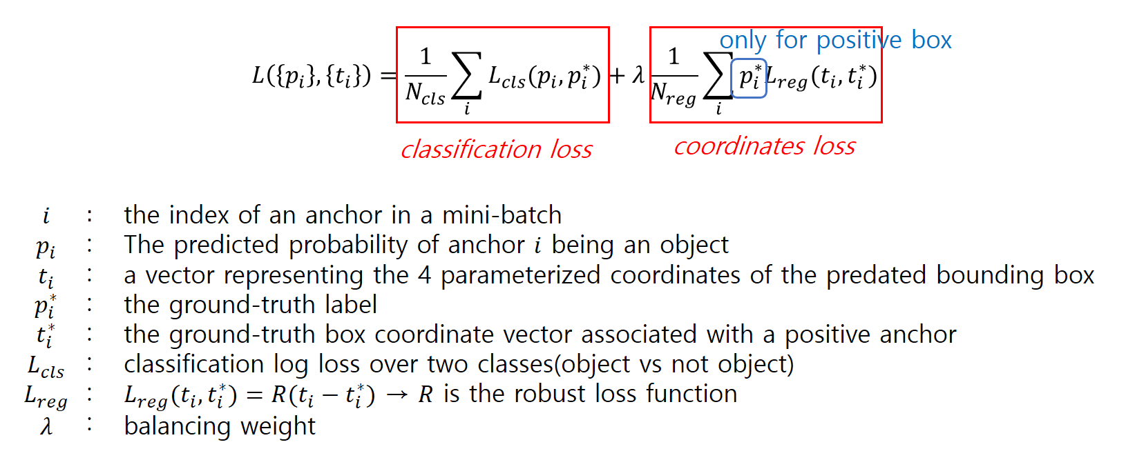 RPN의 훈련을 위한 손실함수로는 물체인지 아닌지 여부와 좌표 오차를 모두 고려하는 multi loss를 사용합니다.