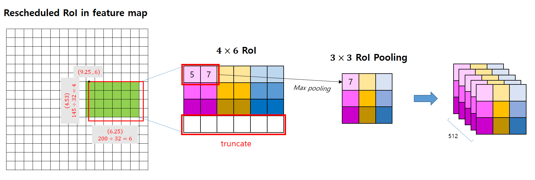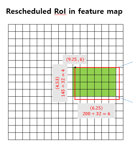 빨간색 상자가 특성 맵 위에 스케일된 박스입니다. 삐져나온 부분은 rounding(반올림)하여 정수값으로 맞춰줍니다.