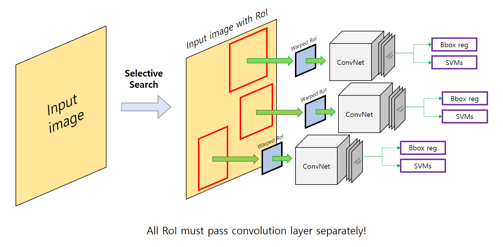 4. 연산을 공유하지 않는 모델들(CNN, SVM, Bbox regressor)이 결합된 형태로 한 번에 학습이 불가능하다.