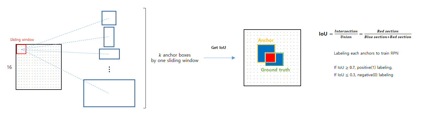 각 앵커박스에 물체가 있는지 없는지는 groud truth와의 IoU를 계산하고, 임계값(논문에서는 0.7) 이상이면 positive labeling(1로 라벨링), 임계값 (논문에서는 0.3) 이하면 negative labeling(0으로 라벨링)하여 훈련에 사용합니다.