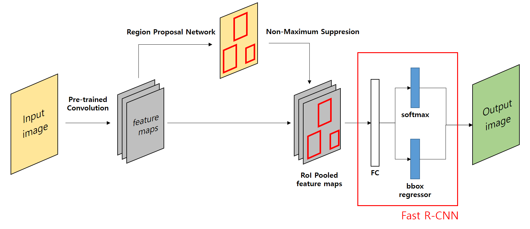 특성 맵에서 RoI 풀링을 통해서 나온 결과물이 ConvNet이 아닌 FC layer를 거치므로 2000번의 CNN 연산이 필요 없어졌습니다.