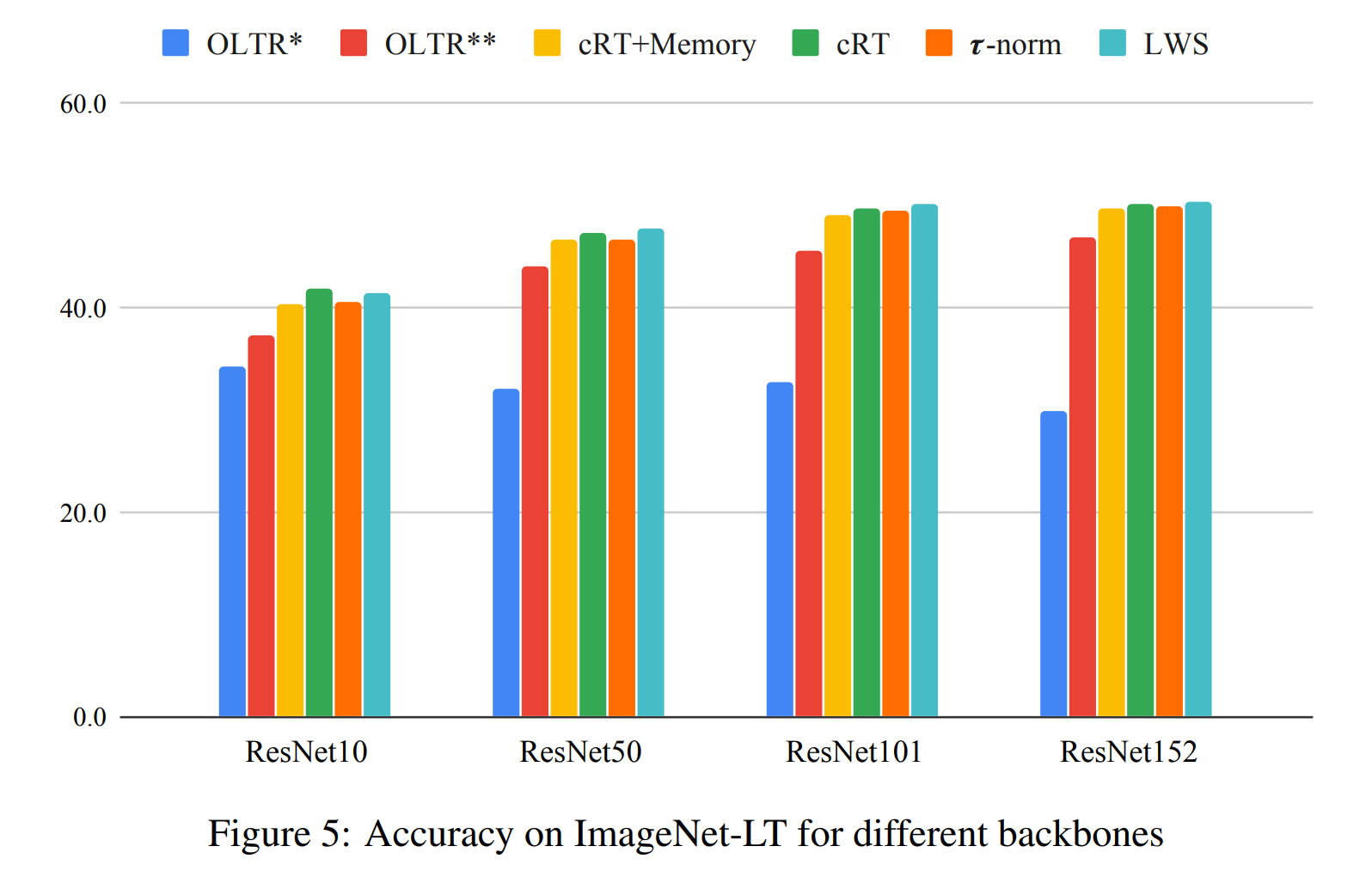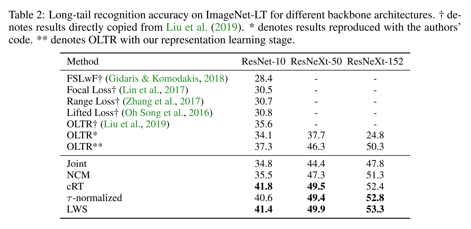 Table 2 에서 long-tail 상황해결을 위해 진행된 다른 연구기법들(FSLwF, Focal Loss, Range Loss 등등)과의 성능비교표를 정리해두었습니다. 해당 논문에서 제시한 기법들(특히 cRT, τ-normalized, LWS)이 더 좋은 정확도를 보임을 확인할 수 있습니다.