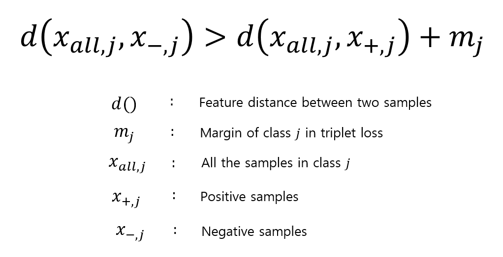 앵커와 positive sample사이의 거리에서 마진 m_j를 더한 거리보다 큰 차이가 앵커와 negative sample 사이에서 나야한다는 것을 수식적으로 이해할 수 있습니다.