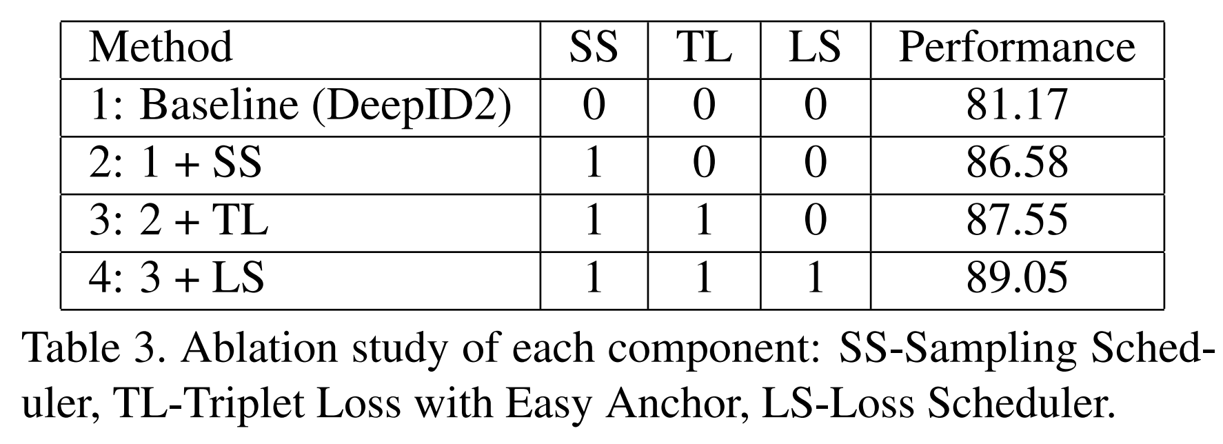 Backbone으로는 DeepID2를 채용하였다. SS(Sampling Scheduler), TL(TEA Loss), LS(Loss Scheduler)가 하나씩 추가될수록 모델의 정확도가 상승하였습니다.