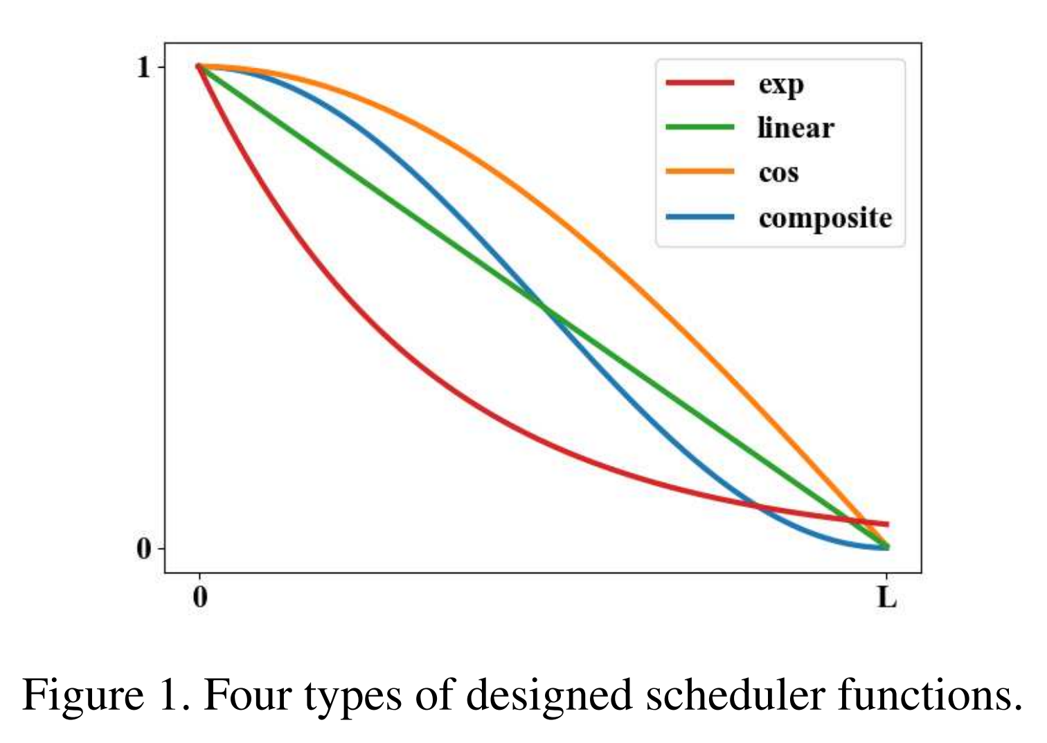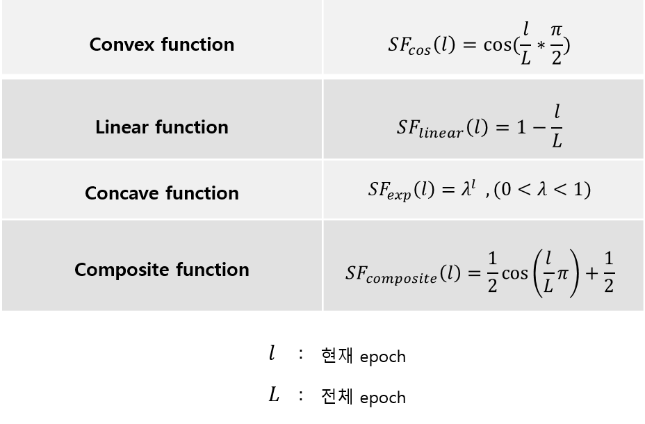 논문에서는 두가지를 스케줄러를 사용하여 curriculum learning을 구현합니다.(curriculum learning이란 쉬운 샘플, 즉 정보가 많은 샘플을 트레이닝 초기에 학습하고 에포크가 진행될수록 어려운 샘플들을 학습하는 것과 같이 훈련 진행에 따른 learning focus가 달라지는 훈련방식입니다.)