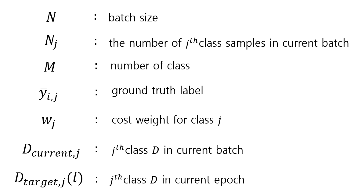현재 배치에 뽑힌 샘플들로 산출한 디스트리뷰션(D_current,j)이 에포크에서 정해준 디스트리뷰션(D_target,j(l))을 넘는다면 손실함수에 포함하지 않는다는 것을 의미합니다.