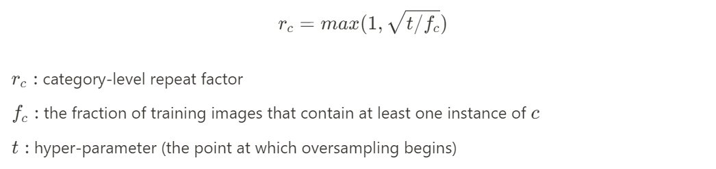 repeat factor 부분이 바뀌었다는 것을 알 수 있으실텐데요. 이미지 비율과 클래스의 비율 두가지를 고려하고, 이 둘의 기하평균을 repeat factor로 적용하기 때문에 이전보다 Long-tail 분포의 대표성이 더 뛰어난 샘플링 전략입니다.