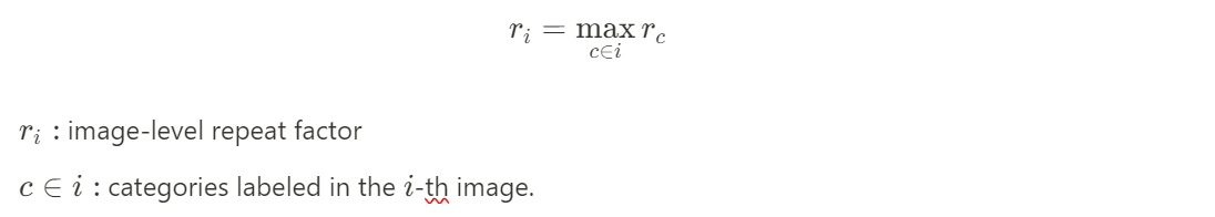논문의 수식을 다시 한번 살펴보고 가겠습니다. 적은 클래스가 포함된 이미지일수록 image-level repeat factor가 커지게 되고, 해당이미지가 훈련에 적용될 수 있는 기회를 더 많이 부여하는 작업이 필요합니다.