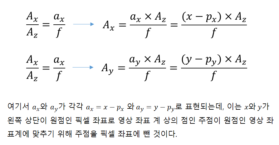 다음 수식과 같은 과정을 거쳐 3차원 공간에서 물체가 카메라와 x,y,z 축 상에서 얼마나 떨어져있는지를 구할 수 있습니다.
