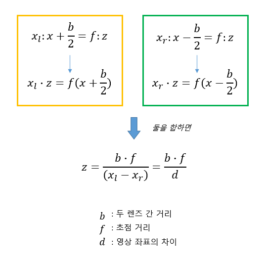 b와 f는 카메라의 내부 파라미터이고, 두 영상 좌표의 차이값을 구해내면 우리가 원하는 물체와의 거리 z를 구할 수 있습니다.