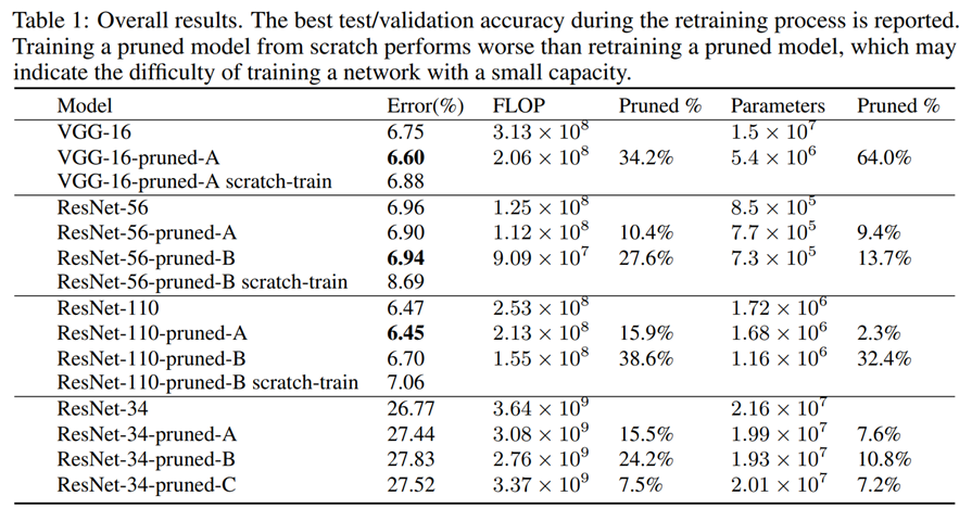 논문은 VGG16 on CIFAR-10, ResNet-56 on CIFAR-10, ResNet-34 on ImageNet 이렇게 3가지 실험 결과를 정리합니다.
