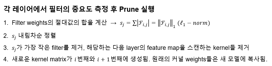 ∙ 최소한의 성능 감소로 convolution layer의 filter들을 pruning, 모델의 연산량을 줄일 수 있다