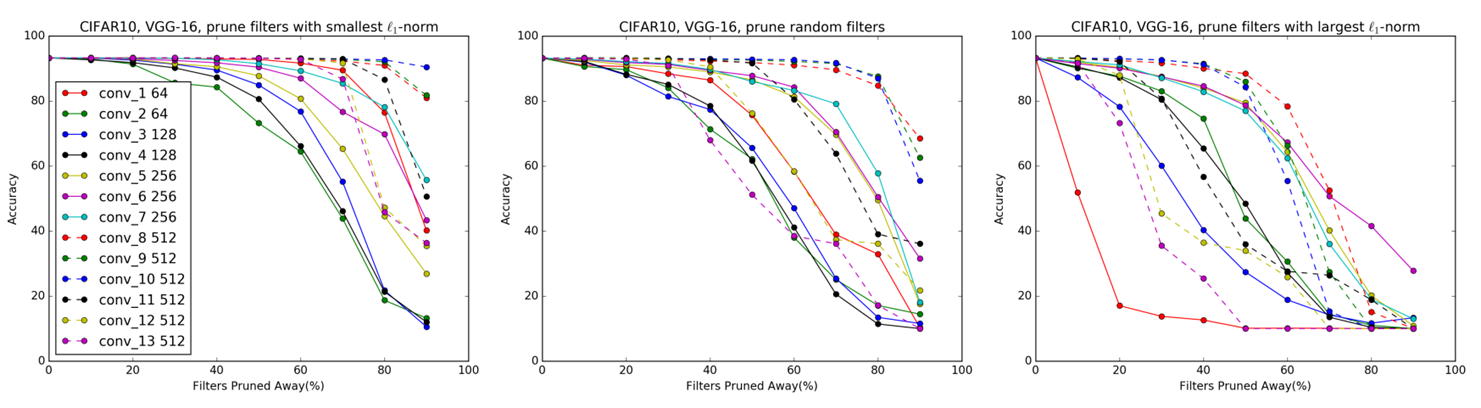 또한 l1-norm을 기준으로 작은 순서대로 필터를 제거했을 때, 랜덤하게 제거했을 때, 큰 순서대로 필터를 제거했을 때의 정확도를 비교한 결과도 제시합니다.