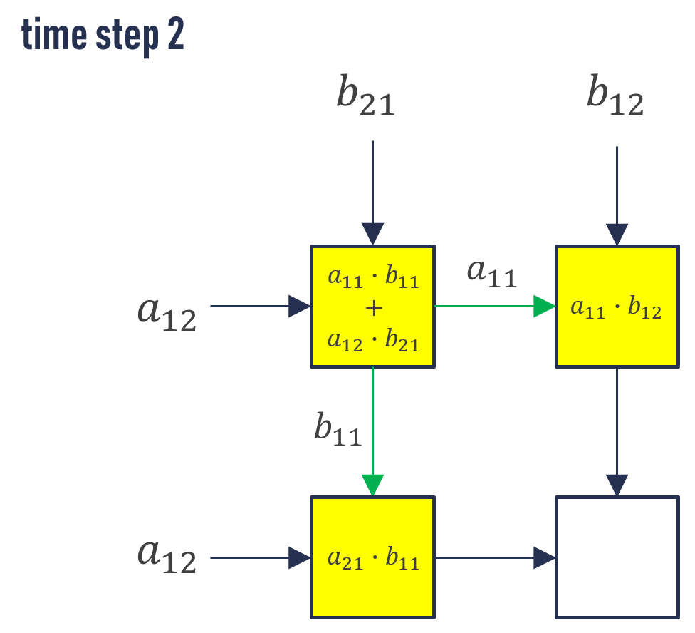 2x2 시스톨릭 어레이에서의 행렬곱 연산은 보시는 그림과 같이 이루어 집니다.