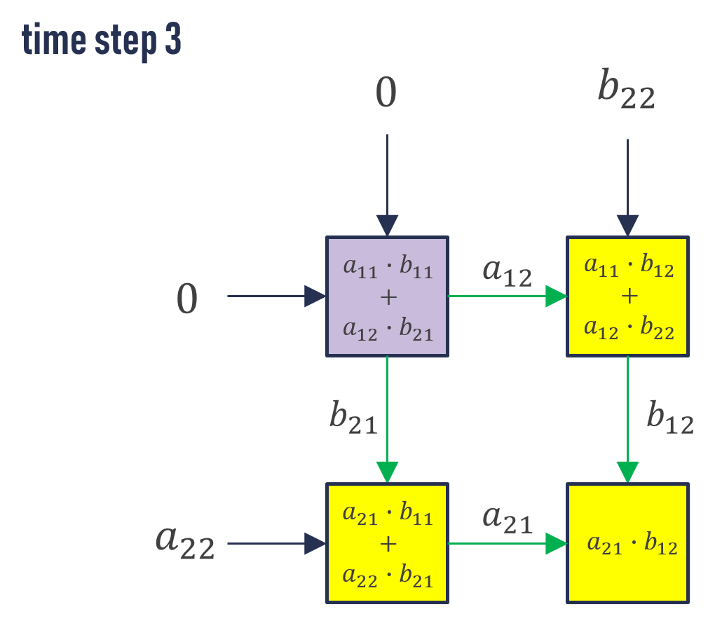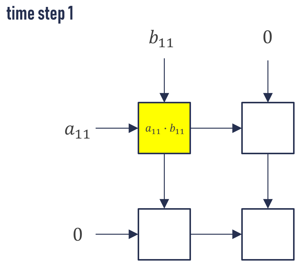위의 행렬곱과 같은 연산을 수행하는 2x2 시스톨릭 어레이입니다. 각 행렬 요소와 0값이 각 time step마다 하나의 PE에서 곱해지고 누적된 후, 다음 PE로 요소 값을 넘겨줍니다.