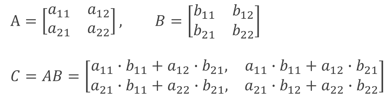 행렬 A와 B, 그리고 이 두 행렬의 곱은 위 수식과 같이 이루어지게 됩니다. 곱하고 더하는 과정이 반복되는 것을 확인할 수 있습니다.
