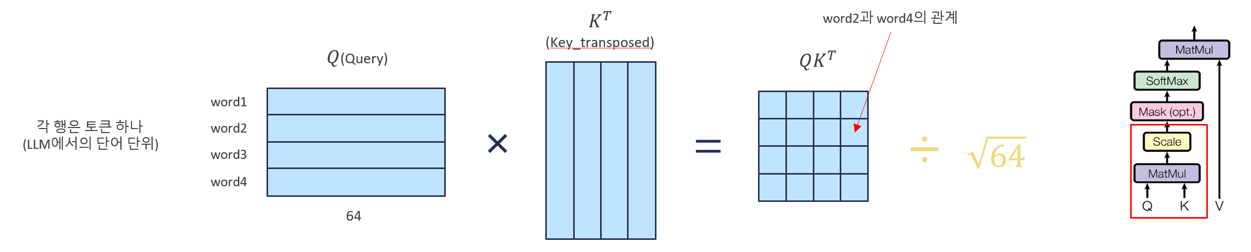 그렇게 얻은 Query행렬과 transeposed Key 행렬이 곱해져서 4x4의 어텐션 스코어 행렬 QK^T가 됩니다. 이 행렬곱 연산으로 입력문장에서 단어 간의 관계를 파악하게 됩니다. QK^T 행렬의 1,1 은 word1과 word1의 관계를 의미하고, 1,2는 word1과 word2의 관계를 의미하게 되겠죠? 그리고 이 행렬을 sqrt(embedding dimension)으로 나누는 scaling단계를 거칩니다.