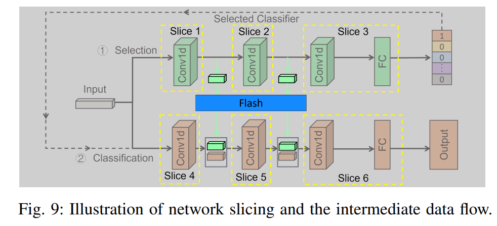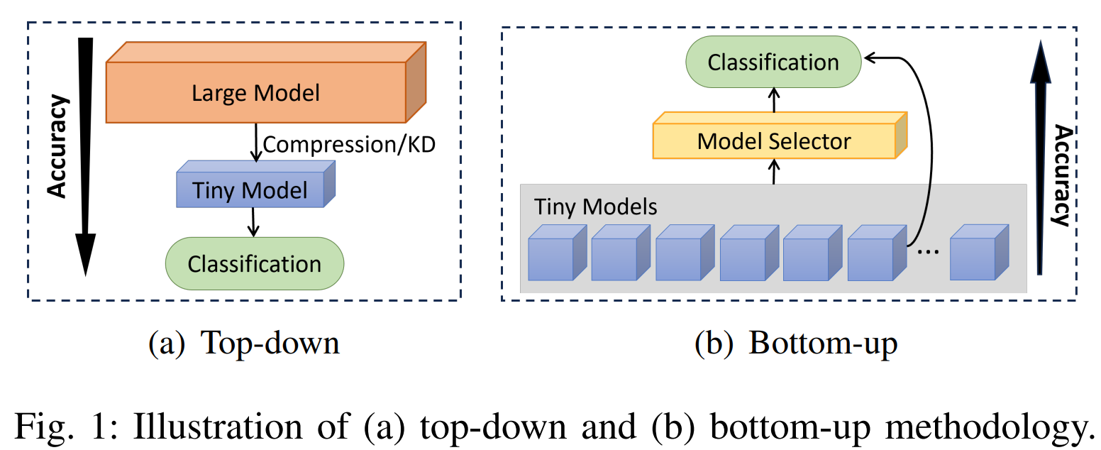 Fig. 1을 보시면 Top-down 메소드와 Bottom-up 메소드가 제시되어 있습니다. 프루닝과 양자화, 지식 증류(KD)와 같은 방법으로 모델을 압축하는 방식이 Top-down방식, 작은 모델 여러개를 둔 후에 model selector를 두어 입력에 대해서 어떤 모델에 대한 출력을 최종 출력으로 선택할지 결정되는 방식이 Bottom-up 방식입니다.(인간활동, 키워드 감지, 감정인식과 같은 간단한 1차원 시계열 데이터셋을 사용한 분류 작업)