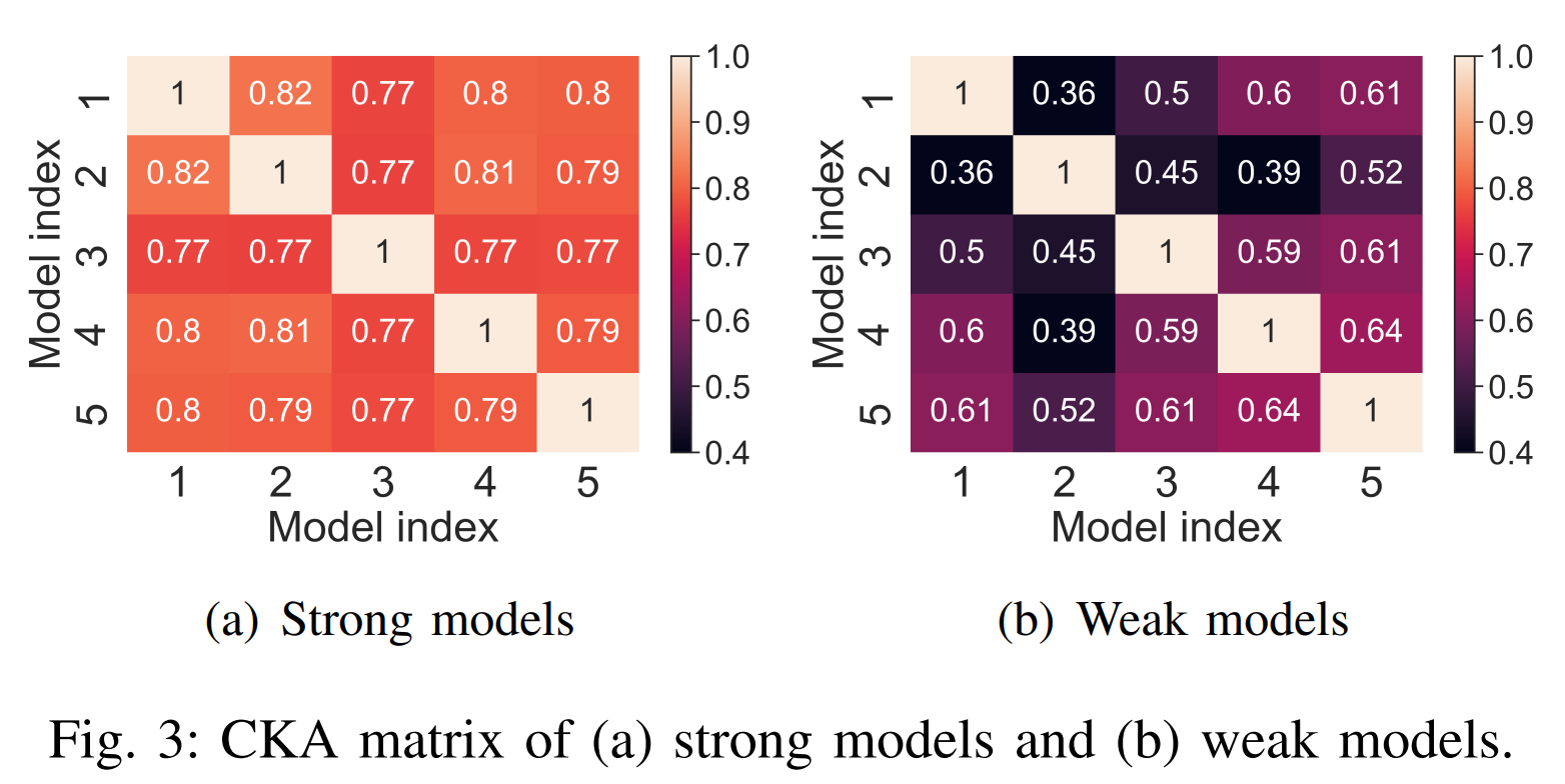 CKA 행렬은 모델 간 feature extraction파트에서의 유사도를 측정하는 대표적인 방법입니다. 강한 모델 5개에서는 높은 유사도를 보이는데, 이건 모델들이 서로 유사한 특징들을 학습하였다라는 것을 의미하고, 일반적으로 모든 입력에 대해서 잘 추론해낼 수 있게 훈련되었다는 것을 의미합니다. 반면에 약한 모델 5개는 모델 간 유사도가 적게 나타나는데, 이는 모델간의 다양성이 더 크다는 것을 의미합니다.