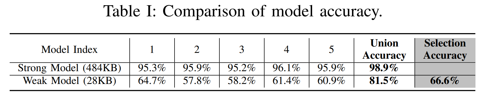 약한 모델의 크기가 강한모델보다 약 17배 정도 적다는 것을 확인할 수 있습니다. 그리고 모델 각각의 정확도는 낮게 측정되지만, Union accuracy로는 준수한 정확도를 보임을 알 수 있습니다. (Union accuracy란 적어도 하나의 분류기에 의해 올바르게 분류된 샘플의 비율을 뜻합니다.)