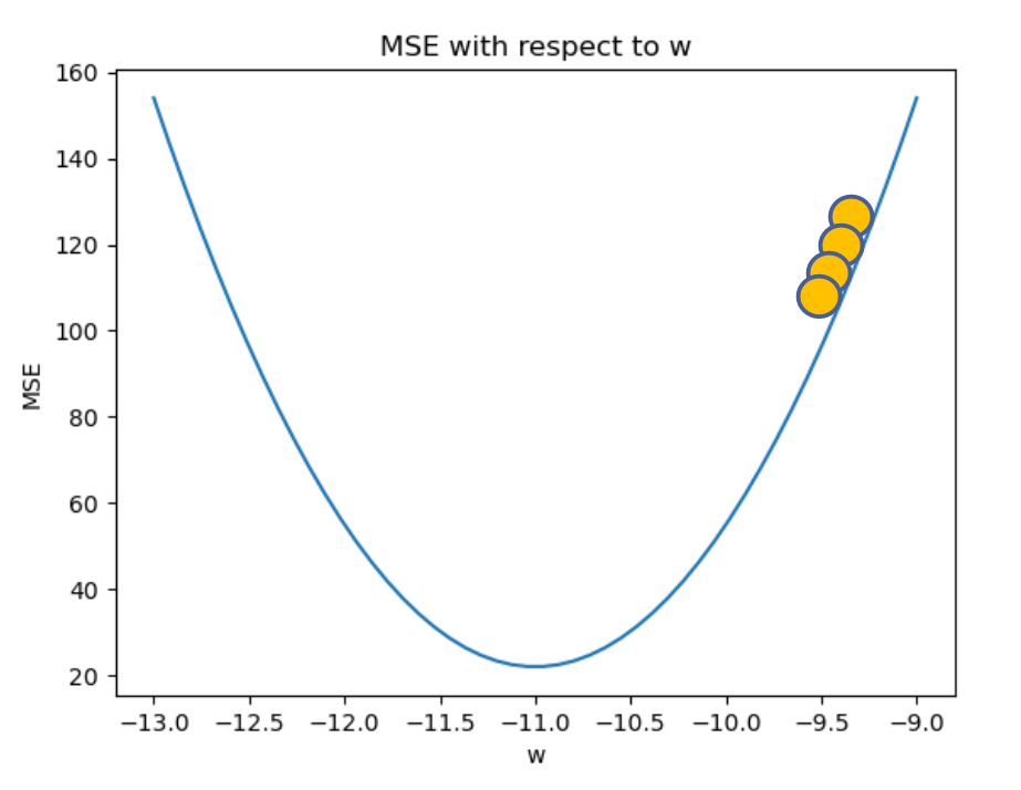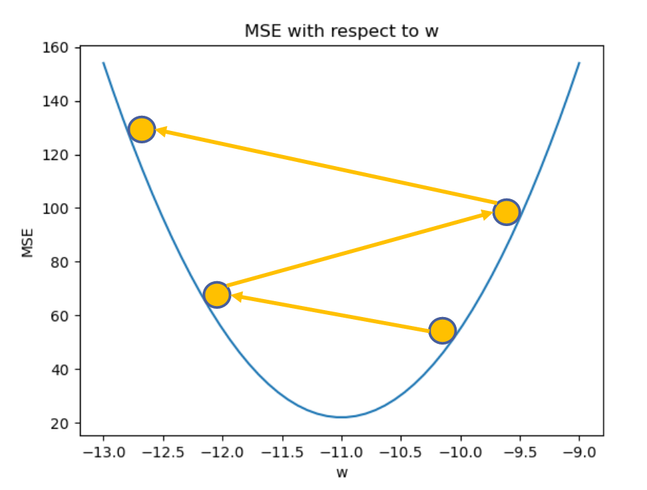 learning rate를 너무 크게 설정하면 이와 같이 최소점을 지나치는 경우가 발생할 수 있다. 이 경우 업데이트된 w와 최소점에서의 w간 차이의 절댓값이 이전보다 커지게 되면 오히려 학습을 지속할 수록 오차가 커지기도 한다.