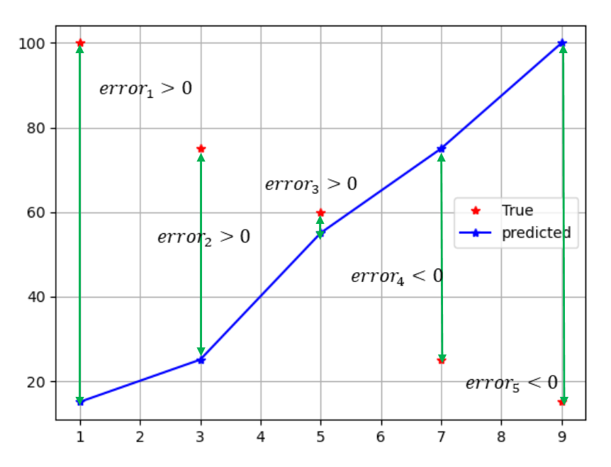 이 같은 경우 에러들간의 부호가 달라지게 된다. 실제값에서 예측치를 뺀 값이 error가 되는데, 부호가 다르기 때문에 서로 상쇄되어 오차의 크기를 대변할 수 없게 된다.